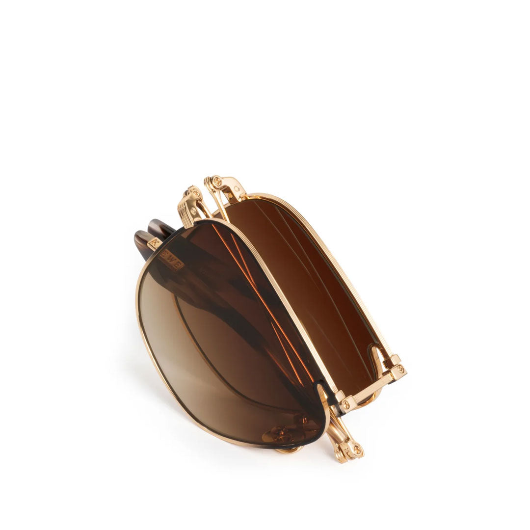 A new level of luxury. ZANDER FOLD is a light-weight & refined aviator that—as the name suggests—features functional temples that satisfyingly fold into a compact shape. Constructed entirely from precious metal with an oversized fit on most face shapes. Includes an additional mini case that the folded frame fits into for those on-the-go.